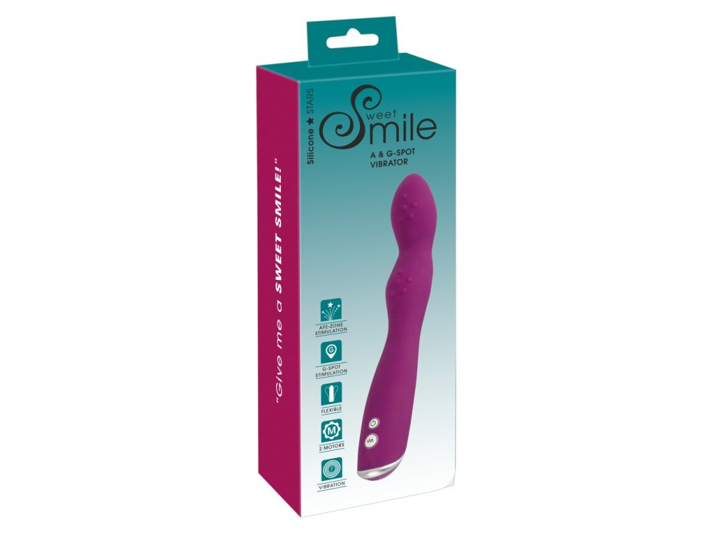 Sweet Smile Duální A/G-Spot Vibrator je flexibilní vibrátor se 2 motory pro cílenou stimulaci bodu G a bodu A (AFE zóny). Má 7 vibračních režimů, stimulační tečky a měkký silikonový povrch pro snadné hluboké zavedení.