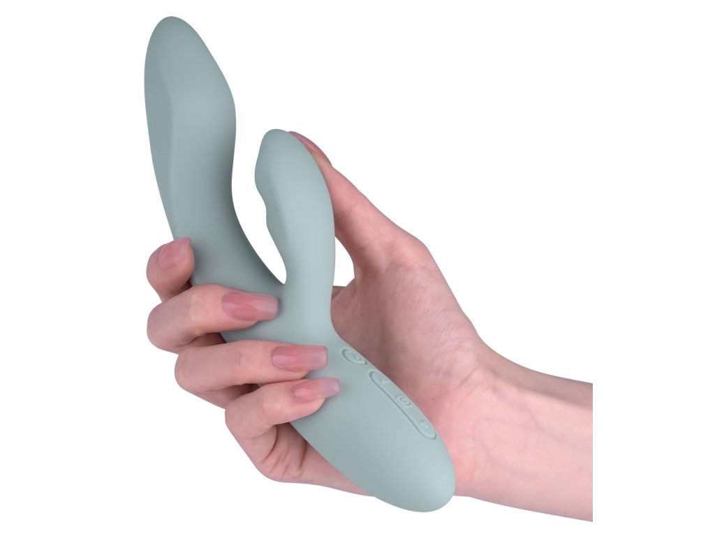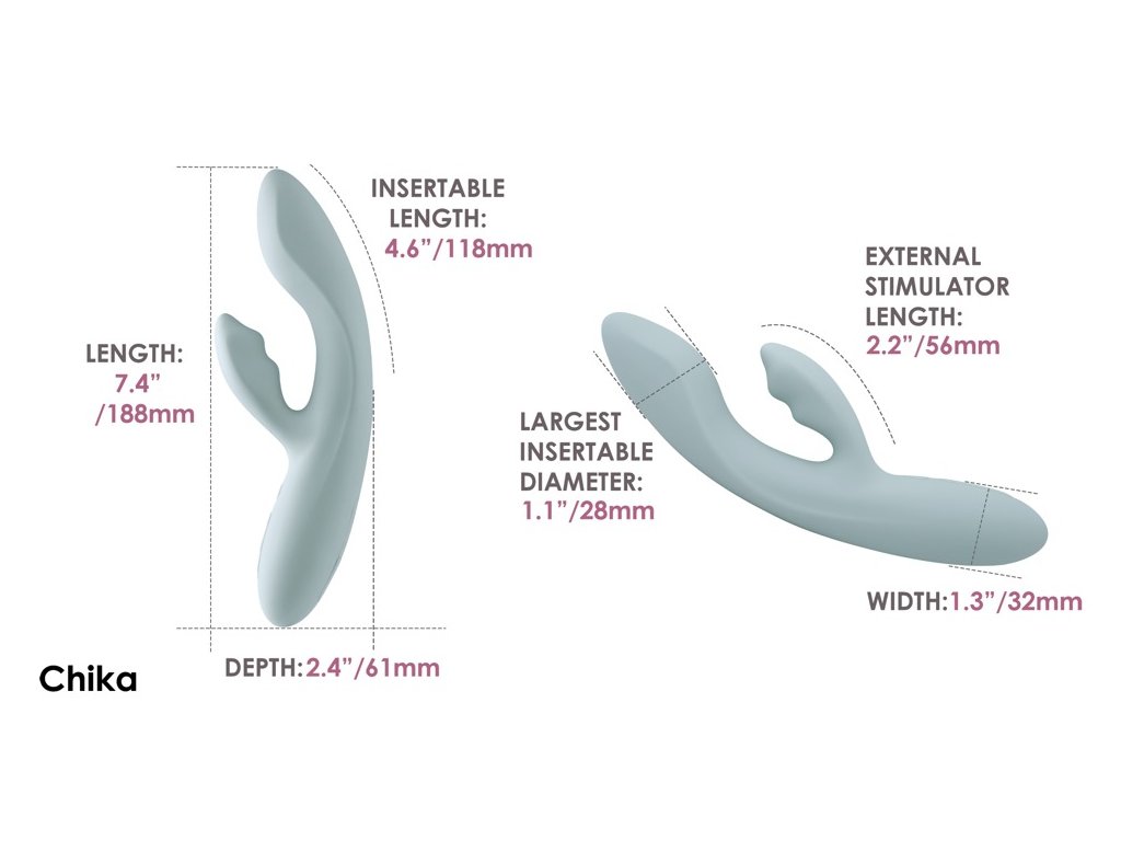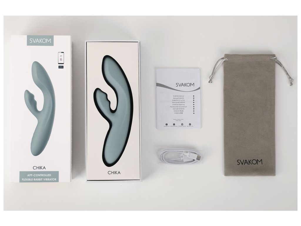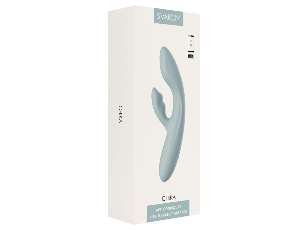 SVAKOM Chika je špičkový králičí vibrátor v elegantní tyrkysové barvě s propracovaným, sofistikovaným designem. Tento vibrační skvost je ztělesněním smyslného interaktivního požitku a je navržen pro intenzivní dvojitou stimulaci vagíny, bodu G a klitorisu. Chika je vyrobena ze sametově měkkého, tekutého silikonu, který je příjemně pevný, ale zároveň úžasně pružný, což zajišťuje maximální komfort a perfektní přizpůsobení pohybům těla.