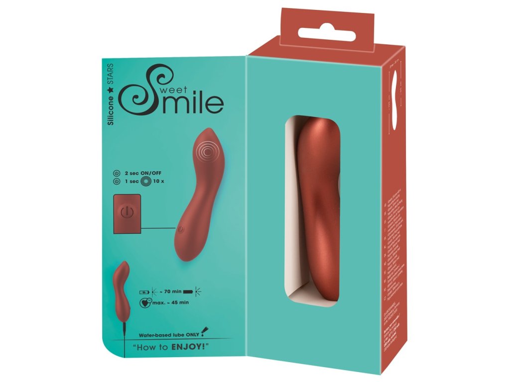 Sweet Smile Flexible Mini G-Spot Vibrator je malý a tichý vibrátor ze speciální metalické edice silikonu s lesklým vzhledem. Má flexibilní zakřivenou špičku pro cílenou stimulaci G-bodu. Nabízí 10 režimů, je vodotěsný a dobíjecí.