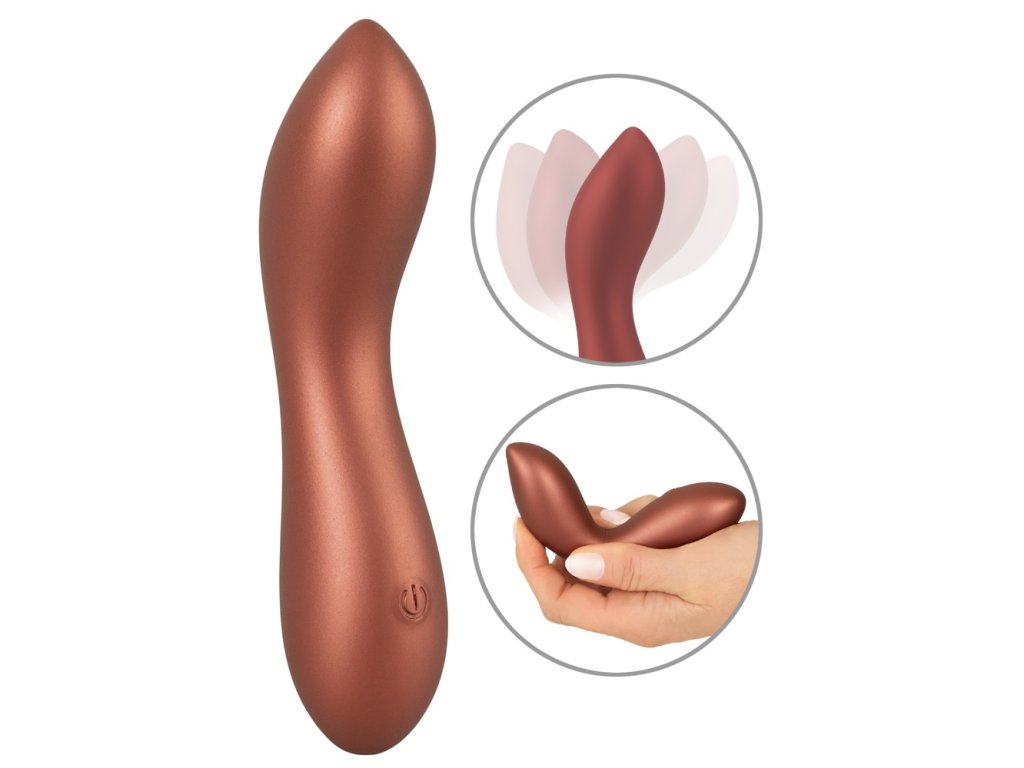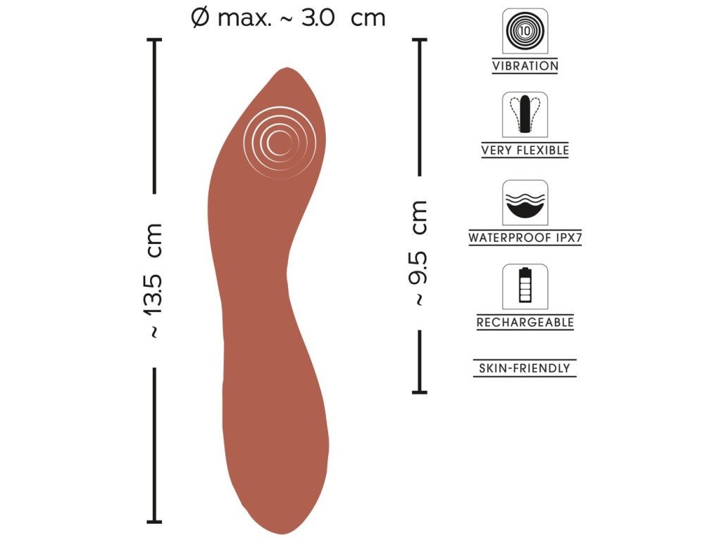 Flexible Mini G-Spot Vibrator je malý, lehký a snadno ovladatelný vibrátor ze speciální edice metalického silikonu v hnědé barvě. Díky sametově měkkému povrchu a decentnímu designu je velmi příjemný při používání.
