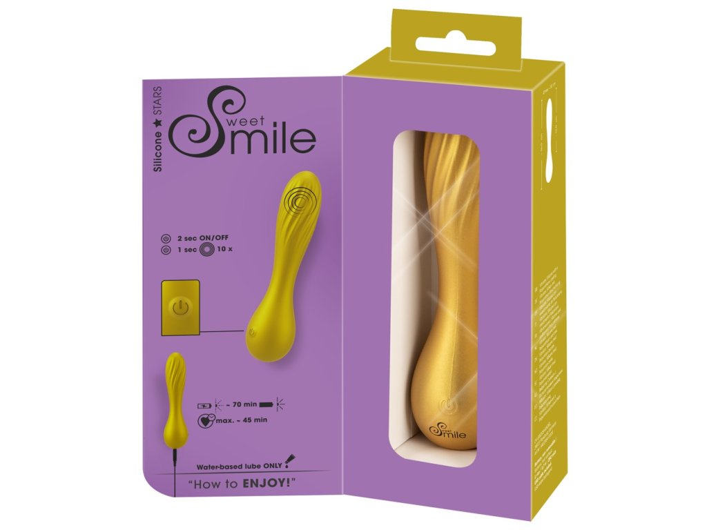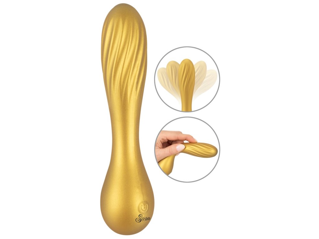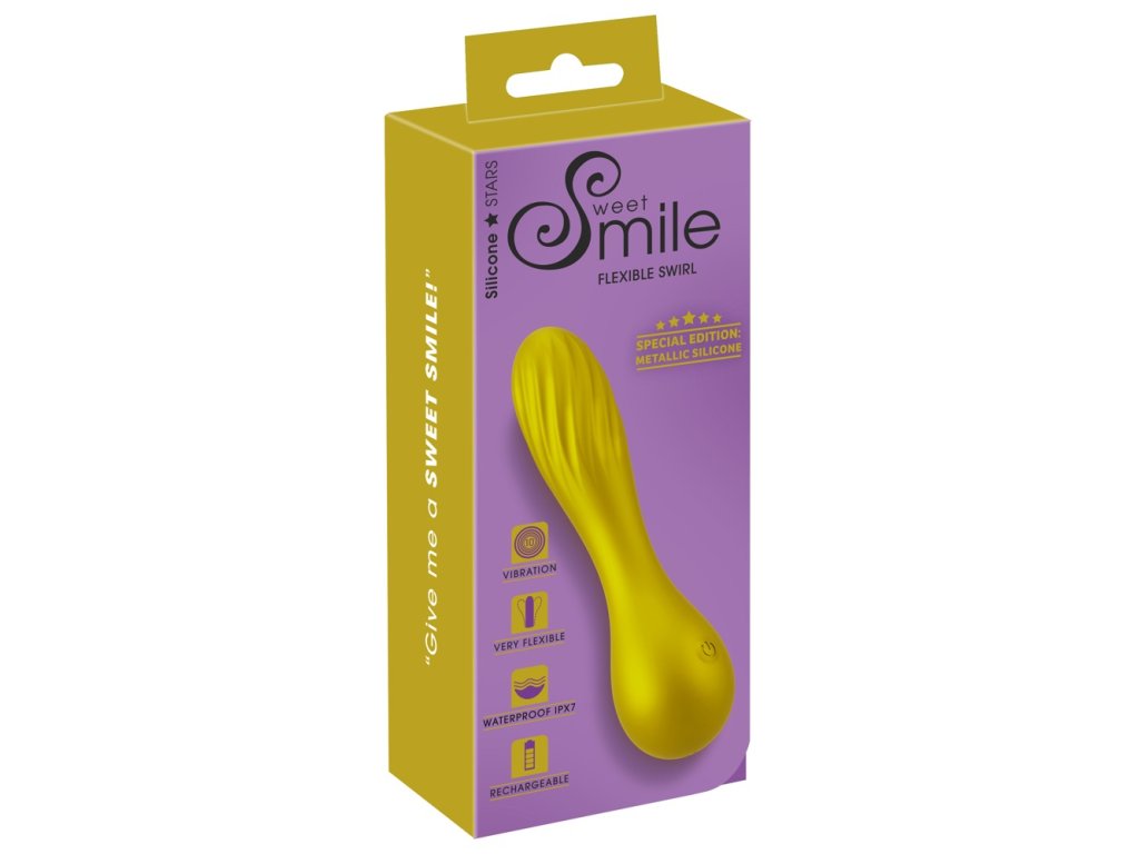 Sweet Smile Flexible Swirl Vibrator je elegantní, tichý vibrátor ze speciální metalické edice ve zlaté barvě. Má velmi flexibilní drážkovanou hlavici pro adaptivní stimulaci. Nabízí 10 vibračních režimů, je vodotěsný a dobíjecí.