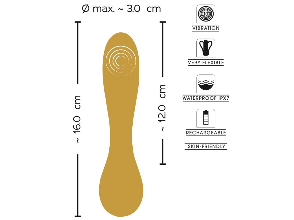 Flexible Swirl Vibrator od Sweet Smile je snadno použitelný a lehký vibrátor ze speciální edice metalického silikonu. Vyznačuje se krásným lesklým matným metalickým vzhledem v elegantní zlaté barvě a decentním designem. Je vyroben ze sametově měkkého silikonu (PU), který je příjemný na dotek.