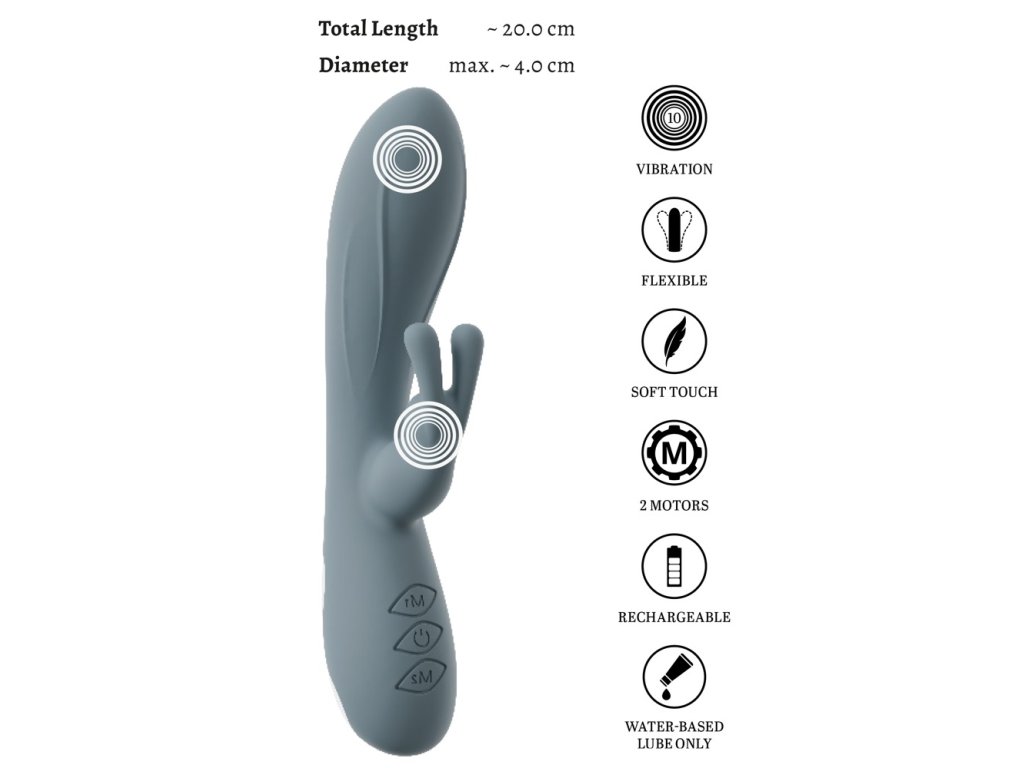beau cœur VELINA Rabbit je flexibilní, duální králičí vibrátor s elegantním modrým designem. Dva tiché motory nabízejí 2x 10 režimů, které lze ovládat samostatně pro intenzivní a přizpůsobivé potěšení. Je vyroben ze sametově měkkého silikonu, vodotěsný a dobíjecí.