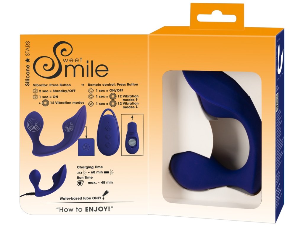 Sweet Smile RC Anální Vibrátor do Kalhotek je diskrétní duální systém s vibračním análním kolíkem a lay-on vibrátorem. Poskytuje simultánní anální a klitorální stimulaci. Má 2 motory, 12 režimů a ovládá se dálkovým ovladačem. Je vyroben z měkkého silikonu a je dobíjecí.