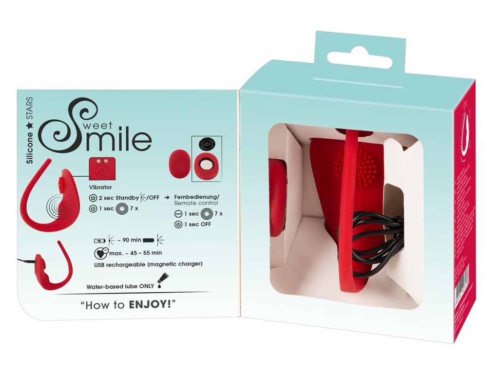 Sweet Smile RC Panty Vibrator je plochý, anatomicky tvarovaný vibrátor do kalhotek pro simultánní stimulaci vulvy, klitorisu a anu/hráze. Má 7 tichých vibračních režimů a dálkové ovládání. Je vodotěsný, vyroben ze sametově hebkého silikonu a je dobíjecí.