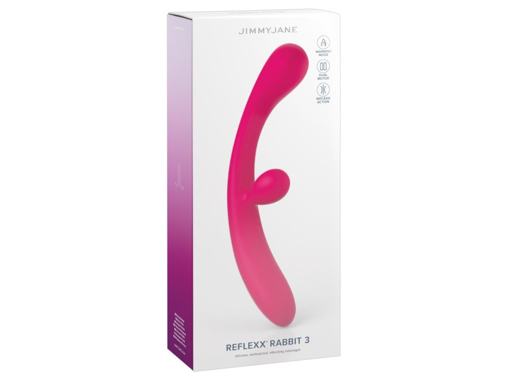 JimmyJane Reflexx Rabbit 3 je puristická sexy raketa ve svěží růžové barvě, která se dokonale přizpůsobí tvému tempu. Tento super ohebný duální vibrátor je navržen pro dokonalou synchronizaci G-bodu, klitorisu a tvých pohybů. Nabízí 10 vibračních režimů pro nekonečné kombinace potěšení a co je nejlepší: funkce ohřevu hedvábný silikon bleskově zahřeje na body-friendly teplotu! Je vodotěsný, dobíjecí a má cestovní zámek pro diskrétní eskapády. S Reflexx Rabbit 3 si užiješ plný program pro potěšení uvnitř i vně, kdykoliv a kdekoliv.