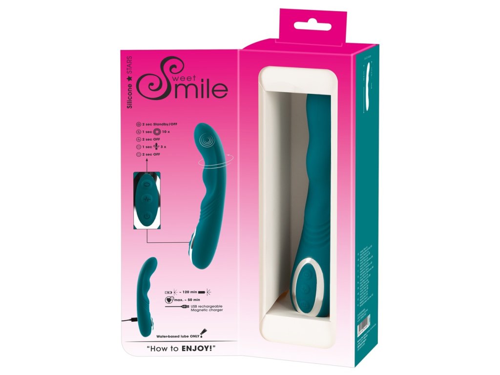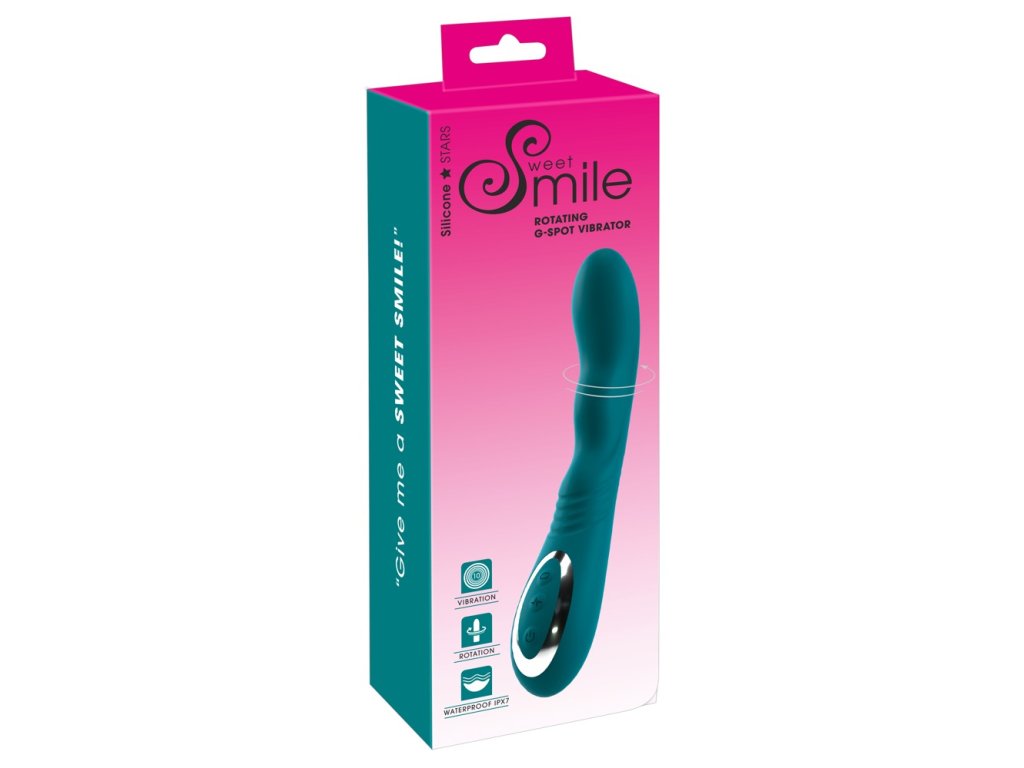Rotující G-Spot Vibrator od Sweet Smile je dokonale zakřivený vibrátor navržený pro cílenou stimulaci bodu G. Disponuje speciálně tvarovanou a drážkovanou rotační špičkou, která intenzivně působí na G-bod během vaginální masáže. Výkonný motor poskytuje jak intenzivní rotaci (3 rychlosti), tak i hluboké vibrace (10 režimů), díky čemuž je vibrátor vhodný i pro anální potěšení nebo stimulaci jiných erotogenních zón.