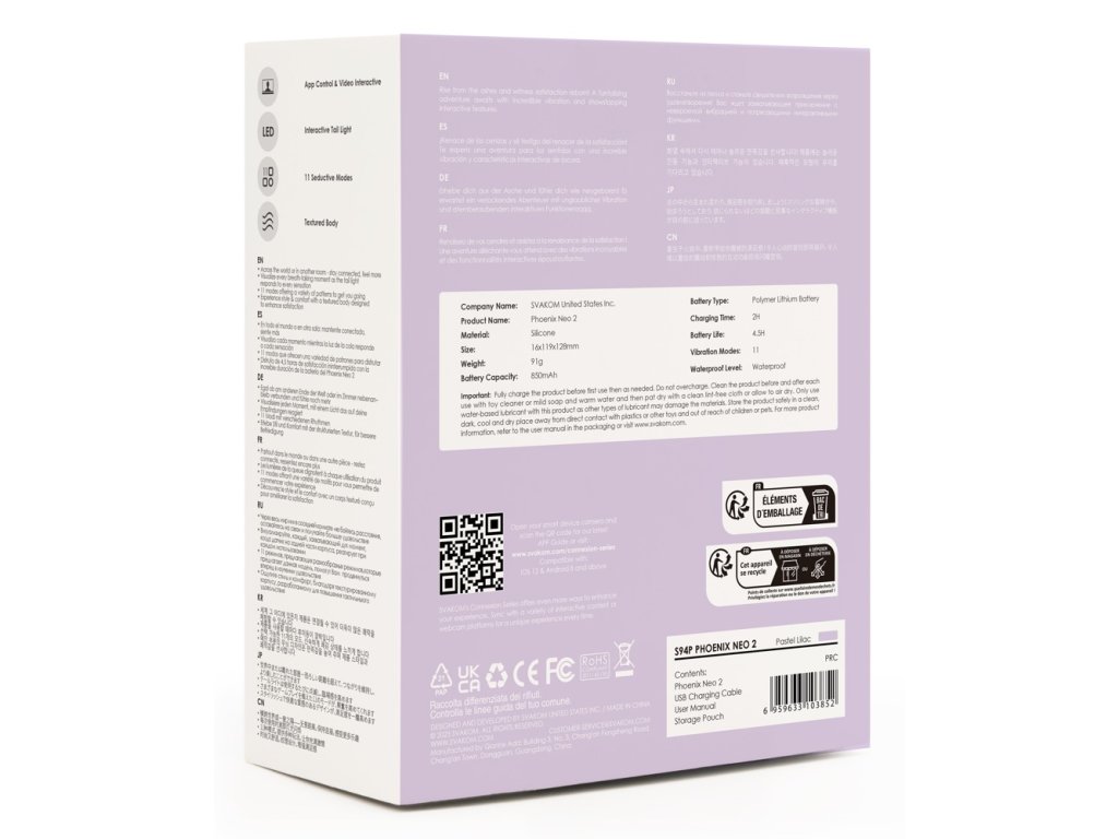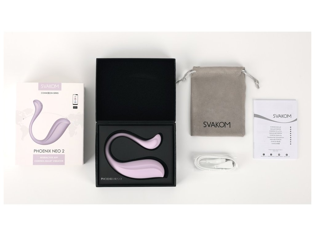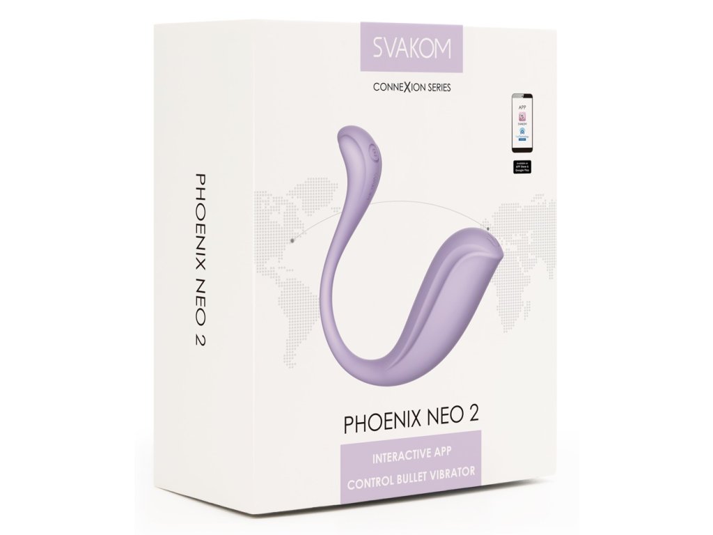 Jako součást Connexion Serie je Phoenix Neo 2 plně kompatibilní s aplikací SVAKOM a FeelConnect , která otevírá svět interaktivní intimity. Partner může převzít kontrolu nad vibracemi kdykoli a odkudkoli na světě. Vibrace lze synchronizovat s interaktivními videi, kde se intenzita a rytmus přizpůsobí ději. Navíc se můžete zapojit do online přenosů, kde mohou diváci nebo partner ovládat vaše potěšení v reálném čase. Vibrátor je vyroben z ultrajemného silikonu s PU povrchem, je vodotěsný a dodáván s USB nabíjecím kabelem a úložným pouzdrem.